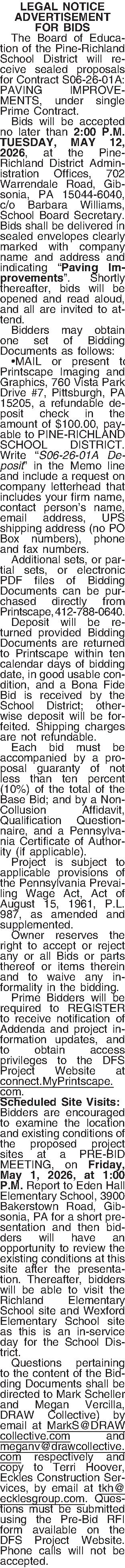 ¶ The Board of Education of the Pine-Richland School District will receive sealed proposals for Contract S06-26-01A: PAVING IMPROVE-MENTS, under single Prime Contract.