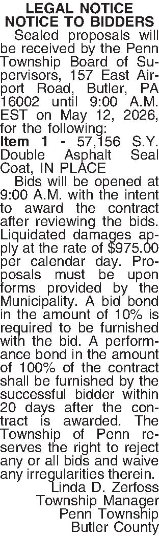 ¶ Sealed proposals will be received by the Penn Township Board of Supervisors, 157 East Airport Road, Butler, PA 16002 until 9:00 A.M. EST on May 12, 2026, for the following:
