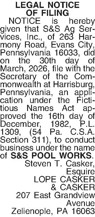 ¶ NOTICE is hereby given that S&S Ag Services, Inc., of 263 Harmony Road, Evans City, Pennsylvania 16033, did on the 30th day of March, 2026, file with the Secretary of the Com-monwealth at Harrisburg, Pennsylvania, an appli-cation under the Fictitious Names Act approved the 16th day of December, 1982, P.L. 1309, (54 Pa. C.S.A. Section 311), to conduct business under the name of S&S POOL WORKS.