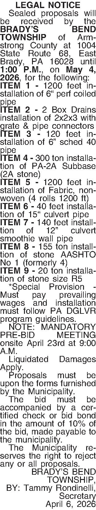 LEGAL NOTICE ¶ Sealed proposals will be received by the BRADY’S BEND TOWNSHIP of Armstrong County at1004 State Route 68, East Brady, PA 16028 until 1:00 P.M., on May 4, 2026,for the following: ITEM 1 - 1200 feet installation of 6“ perf coiled pipe ITEM 2- 2 Box Drains installation of 2x2x3 with grate & pipe connectors ITEM 3- 120 feet installation of 6” sched 40 pipe ITEM 4- 300 ton installation of PA-2A Subbase (2A stone) ITEM 5- 1200 feet installation of Fabric, non-woven (4 rolls 1200 ft) ITEM 6- 40 feet installation of 15“ culvert pipe ITEM 7- 140 feet installtion of 12” culvert smoothie wall pipe ITEM 8- 155 ton installtion of stone AASHTO No 1 (formerly 4) ITEM 9- 20 ton installation of stone size R5 ¶ *Special Provision - Must pay prevailing wages and installation must follow PA DGLVR program guidelines. ¶ NOTE: MANDATORY PRE-BID MEETING onsite April 23rd at 9:00 A.M. ¶ Liquidated Damages Apply. ¶ Proposals must be upon the forms furnished by the Municipality. ¶ The bid must be accompanied by a certified check or bid bond in the amount of 10% of the bid, made payable to the municipality. ¶ The Municipality reserves the right to reject any or all proposals. BRADY’S BEND TOWNSHIP, BY: Tammy Rondinelli, Secretary April 6, 2026