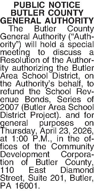 PUBLIC NOTICE BUTLER COUNTY GENERAL AUTHORITY ¶ The Butler County General Authority (“Auth-ority”) will hold a special meeting to discuss a Resolution of the Authority authorizing the Butler Area School District, on the Authority’s behalf, to refund the School Revenue Bonds, Series of 2007 (Butler Area School District Project). and for general purposes on Thursday, April 23, 2026, at 1:00 P.M., in the offices of the Community Development Corporation of Butler County, 110 East Diamond Street, Suite 201, Butler, PA 16001.
