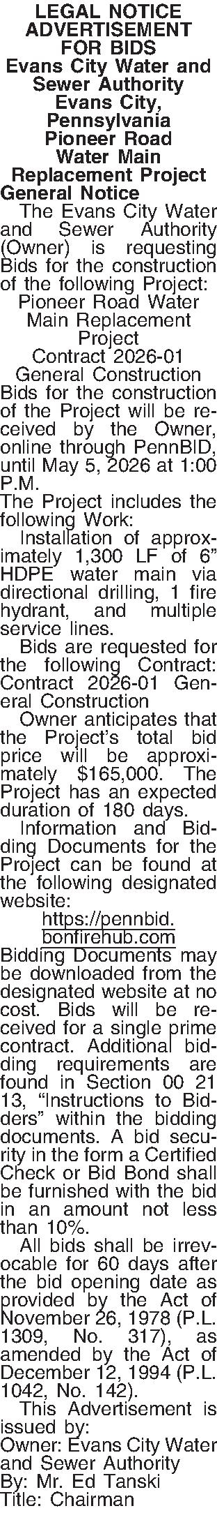 LEGAL NOTICE ADVERTISEMENT FOR BIDS Evans City Water and Sewer Authority Evans City, Pennsylvania Pioneer Road Water Main Replacement Project General Notice ¶ The Evans City Water and Sewer Authority (Owner) is requesting Bids for the construction of the following Project: Pioneer Road Water Main Replacement Project Contract 2026-01 General Construction Bids for the construction of the Project will be received by the Owner, online through PennBID, until May 5, 2026 at 1:00 P.M. The Project includes the following Work: ¶ Installation of approx-imately 1,300 LF of 6” HDPE water main via directional drilling, 1 fire hydrant, and multiple service lines. ¶ Bids are requested for the following Contract: Contract 2026-01 General Construction ¶ Owner anticipates that the Project’s total bid price will be approxi-mately $165,000. The Project has an expected duration of 180 days. ¶ Information and Bidding Documents for the Project can be found at the following designated website: https://pennbid. bonfirehub.com Bidding Documents may be downloaded from the designated website at no cost. Bids will be received for a single prime contract. Additional bidding requirements are found in Section 00 21 13, “Instructions to Bidders” within the bidding documents. A bid security in the form a Certified Check or Bid Bond shall be furnished with the bid in an amount not less than 10%. ¶ All bids shall be irrevocable for 60 days after the bid opening date as provided by the Act of November 26, 1978 (P.L. 1309, No. 317), as amended by the Act of December 12, 1994 (P.L. 1042, No. 142). ¶ This Advertisement is issued by: Owner: Evans City Water and Sewer Authority By: Mr. Ed Tanski Title: Chairman