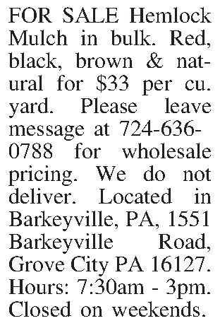 FOR SALE Hemlock Mulch in bulk. Red, black, brown & natural for $33 per cu. yard. Please leave message at 724-636-