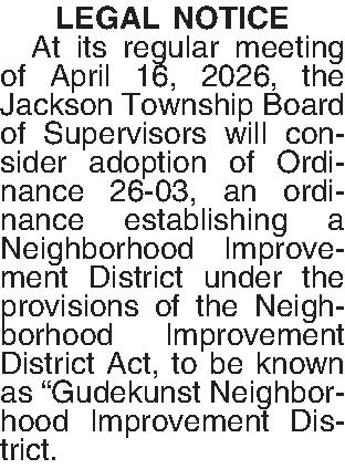 LEGAL NOTICE ¶ At its regular meeting of April 16, 2026, the Jackson Township Board of Supervisors will consider adoption of Ordinance 26-03, an ordinance establishing a Neighborhood Improve-ment District under the provisions of the Neigh-borhood Improvement District Act, to be known as “Gudekunst Neighbor-hood Improvement District.