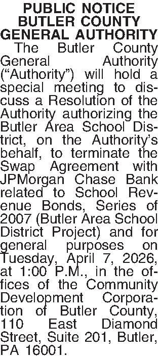 PUBLIC NOTICE BUTLER COUNTY GENERAL AUTHORITY ¶ The Butler County General Authority (“Authority”) will hold a special meeting to discuss a Resolution of the Authority authorizing the Butler Area School District, on the Authority’s behalf, to terminate the Swap Agreement with JPMorgan Chase Bank related to School Revenue Bonds, Series of 2007 (Butler Area School District Project) and for general purposes on Tuesday, April 7, 2026, at 1:00 P.M., in the offices of the Community Development Corporation of Butler County, 110 East Diamond Street, Suite 201, Butler, PA 16001.