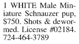 1 WHITE Male Miniature Schnauzer pup, $750. Shots & dewormed. License #02184. 724-464-3789