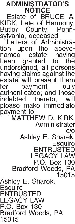 ADMINISTRATOR’S NOTICE ¶ Estate of BRUCE A. KIRK, Late of Harmony, Butler County, Pennsylvania, deceased. ¶ Letters of Administration upon the above-named estate having been granted to the undersigned, all persons having claims against the estate will present them for payment, duly authenticated; and those indebted thereto, will please make immediate payment to: MATTHEW D. KIRK, Administrator c/o Ashley E. Sharek, Esquire ENTRUSTED LEGACY LAW P.O. Box 130 Bradford Woods, PA 15015 Ashley E. Sharek, Esquire ENTRUSTED LEGACY LAW P.O. Box 130 Bradford Woods, PA 15015