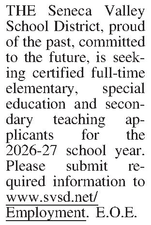 THE Seneca Valley School District, proud of the past, committed to the future, is seeking certified full-time elementary, special education and secondary teaching applicants for the 2026-27 school year. Please submit required information to www.svsd.net/Employment. E.O.E.