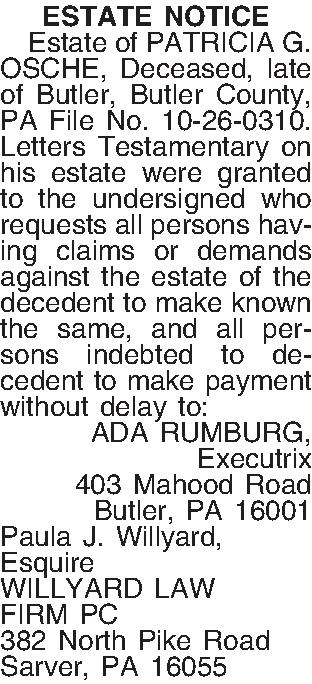 ESTATE NOTICE ¶ Estate of PATRICIA G. OSCHE, Deceased, late of Butler, Butler County, PA File No. 10-26-0310. Letters Testamentary on his estate were granted to the undersigned who requests all persons having claims or demands against the estate of the decedent to make known the same, and all persons indebted to decedent to make payment without delay to: ADA RUMBURG, Executrix 403 Mahood Road Butler, PA 16001 Paula J. Willyard, Esquire WILLYARD LAW FIRM PC 382 North Pike Road Sarver, PA 16055