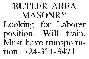 Looking for Laborer position. Will train. Must have transporta-tion. 724-321-3471