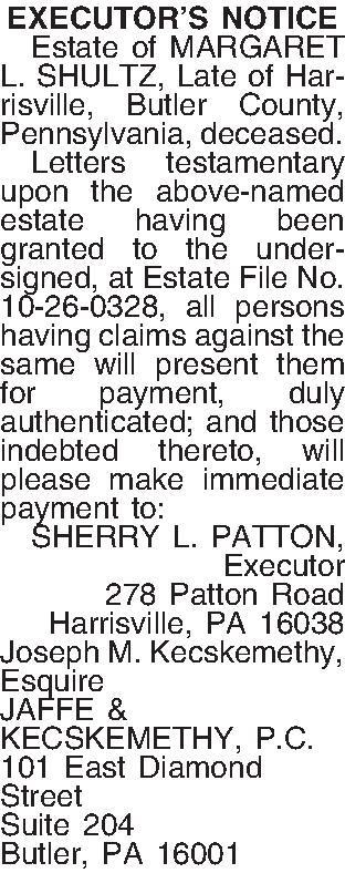 EXECUTOR’S NOTICE ¶ Estate of MARGARET L. SHULTZ, Late of Harrisville, Butler County, Pennsylvania, deceased. ¶ Letters testamentary upon the above-named estate having been granted to the undersigned, at Estate File No. 10-26-0328, all persons having claims against the same will present them for payment, duly authenticated; and those indebted thereto, will please make immediate payment to: SHERRY L. PATTON, Executor 278 Patton Road Harrisville, PA 16038 Joseph M. Kecskemethy, Esquire JAFFE & KECSKEMETHY, P.C. 101 East Diamond Street Suite 204 Butler, PA 16001
