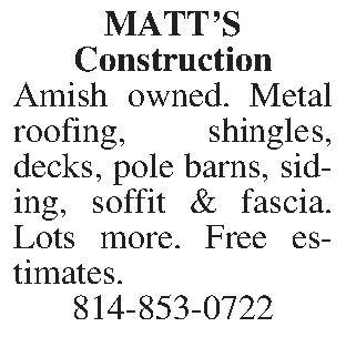 Amish owned. Metal roofing, shingles, decks, pole barns, siding, soffit & fascia. Lots more. Free estimates. 814-853-0722