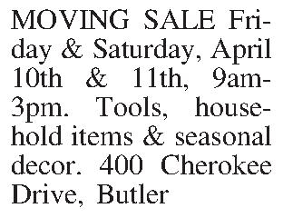 MOVING SALE Friday & Saturday, April 10th & 11th, 9am-3pm. Tools, house-hold items & seasonal decor. 400 Cherokee Drive, Butler