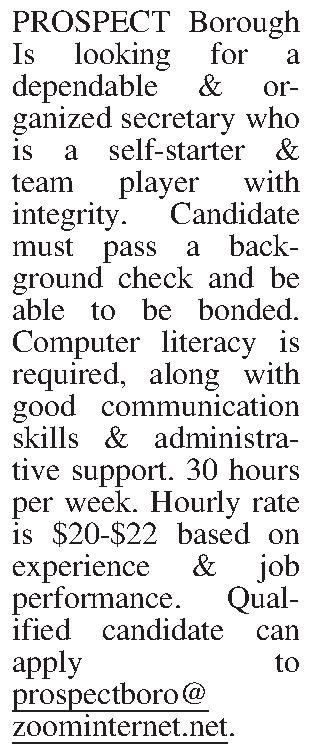 PROSPECT Borough Is looking for a dependable & organized secretary who is a self-starter & team player with integrity. Candidate must pass a background check and be able to be bonded. Computer literacy is required, along with good communication skills & administrative support. 30 hours per week. Hourly rate is $20-$22 based on experience & job performance. Qualified candidate can apply to prospectboro@zoominternet.net.