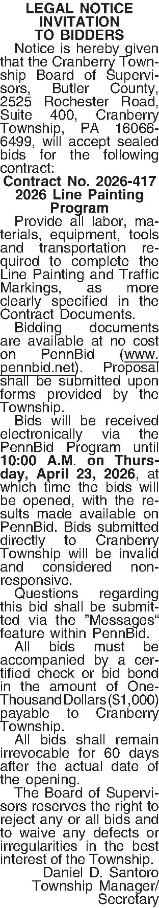 LEGAL NOTICE INVITATION TO BIDDERS ¶ Notice is hereby given that the Cranberry Township Board of Supervisors, Butler County, 2525 Rochester Road, Suite 400, Cranberry Township, PA 16066- 6499, will accept sealed bids for the following contract: Contract No. 2026-417 2026 Line Painting Program ¶ Provide all labor, materials, equipment, tools and transportation required to complete the Line Painting and Traffic Markings, as more clearly specified in the Contract Documents. ¶ Bidding documents are available at no cost on PennBid (www.pennbid.net). Proposal shall be submitted upon forms provided by the Township. ¶ Bids will be received electronically via the PennBid Program until 10:00 A.M. onThurs-day, April 23, 2026, at which time the bids will be opened, with the results made available on PennBid. Bids submitted directly to Cranberry Township will be invalid and considered non-responsive. ¶ Questions regarding this bid shall be submitted via the ”Messages“ feature within PennBid. ¶ All bids must be accompanied by a certified check or bid bond in the amount of One-Thousand Dollars ($1,000) payable to Cranberry Township. ¶ All bids shall remain irrevocable for 60 days after the actual date of the opening. ¶ The Board of Supervisors reserves the right to reject any or all bids and to waive any defects or irregularities in the best interest of the Township. Daniel D. Santoro Township Manager/ Secretary