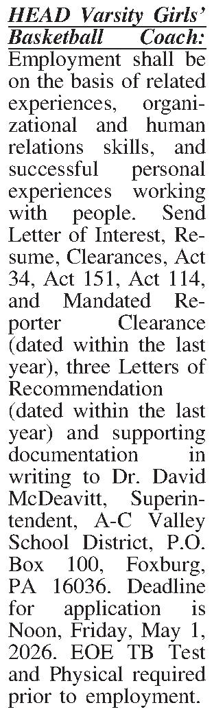 HEAD Varsity Girls’ Basketball Coach: Employment shall be on the basis of related experiences, organi-zational and human relations skills, and successful personal experiences working with people. Send Letter of Interest, Resume, Clearances, Act 34, Act 151, Act 114, and Mandated Reporter Clearance (dated within the last year), three Letters of Recommendation (dated within the last year) and supporting documentation in writing to Dr. David McDeavitt, Superintendent, A-C Valley School District, P.O. Box 100, Foxburg, PA 16036. Deadline for application is Noon, Friday, May 1, 2026. EOE TB Test and Physical required prior to employment.