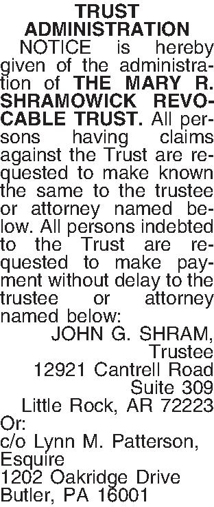 TRUST ADMINISTRATION ¶ NOTICE is hereby given of the administration of THE MARY R. SHRAMOWICK REVOCABLE TRUST. All persons having claims against the Trust are requested to make known the same to the trustee or attorney named below. All persons indebted to the Trust are requested to make payment without delay to the trustee or attorney named below: JOHN G. SHRAM, Trustee 12921 Cantrell Road Suite 309 Little Rock, AR 72223 Or: c/o Lynn M. Patterson, Esquire 1202 Oakridge Drive Butler, PA 16001