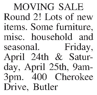 Round 2! Lots of new items. Some furniture, misc. household and seasonal. Friday, April 24th & Saturday, April 25th, 9am-3pm. 400 Cherokee Drive, Butler