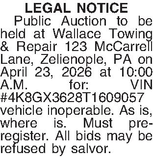 LEGAL NOTICE ¶ Public Auction to be held at Wallace Towing & Repair 123 McCarrell Lane, Zelienople, PA on April 23, 2026 at 10:00 A.M. for: VIN #4K8GX3628T1609057 vehicle inoperable. As is, where is. Must pre-register. All bids may be refused by salvor.