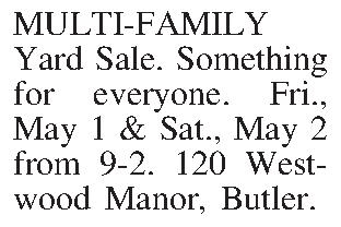 MULTI-FAMILY Yard Sale. Something for everyone. Fri., May 1 & Sat., May 2 from 9-2. 120 Westwood Manor, Butler.