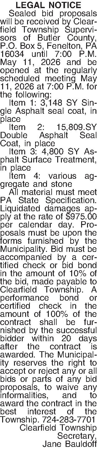 LEGAL NOTICE ¶ Sealed bid proposals will be received by Clearfield Township Supervisors of Butler County, P.O. Box 5, Fenelton, PA 16034 until 7:00 P.M. May 11, 2026 and be opened at the regularly scheduled meeting May 11, 2026 at 7:00 P.M. for the following: ¶ Item 1: 3,148 SY Single Asphalt seal coat, in place ¶ Item 2: 15,809.SY Double Asphalt Seal Coat, in place ¶ Item 3: 4,800 SY Asphalt Surface Treatment, in place ¶ Item 4: various aggregate and stone ¶ All material must meet PA State Specification. Liquidated damages apply at the rate of $975.00 per calendar day. Proposals must be upon the forms furnished by the Municipality. Bid must be accompanied by a certified check or bid bond in the amount of 10% of the bid, made payable to Clearfield Township. A performance bond or certified check in the amount of 100% of the contract shall be furnished by the successful bidder within 20 days after the contract is awarded. The Municipality reserves the right to accept or reject any or all bids or parts of any bid proposals, to waive any informalities, and to award the contract in the best interest of the Township. 724-283-7701 Clearfield Township Secretary, Jane Bauldoff