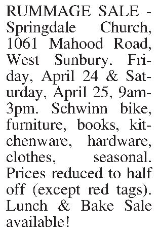 RUMMAGE SALE - Springdale Church, 1061 Mahood Road, West Sunbury. Friday, April 24 & Saturday, April 25, 9am-3pm. Schwinn bike, furniture, books, kit-chenware, hardware, clothes, seasonal. Prices reduced to half off (except red tags). Lunch & Bake Sale available!