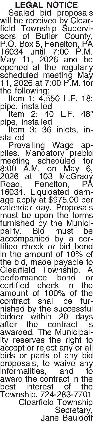 LEGAL NOTICE ¶ Sealed bid proposals will be received by Clearfield Township Supervisors of Butler County, P.O. Box 5, Fenelton, PA 16034 until 7:00 P.M. May 11, 2026 and be opened at the regularly scheduled meeting May 11, 2026 at 7:00 P.M. for the following: ¶ Item 1: 4,550 L.F. 18: pipe, installed ¶ Item 2: 40 L.F. 48” pipe, installed ¶ Item 3: 36 inlets, installed ¶ Prevailing Wage applies. Mandatory prebid meeting scheduled for 8:00 A.M. on May 6, 2026 at 103 McGrady Road, Fenelton, PA 16034. Liquidated damage apply at $975.00 per calendar day. Proposals must be upon the forms furnished by the Municipality. Bid must be accompanied by a certified check or bid bond in the amount of 10% of the bid, made payable to Clearfield Township. A performance bond or certified check in the amount of 100% of the contract shall be furnished by the successful bidder within 20 days after the contract is awarded. The Municipality reserves the right to accept or reject any or all bids or parts of any bid proposals, to waive any informalities, and to award the contract in the best interest of the Township. 724-283-7701 Clearfield Township Secretary, Jane Bauldoff