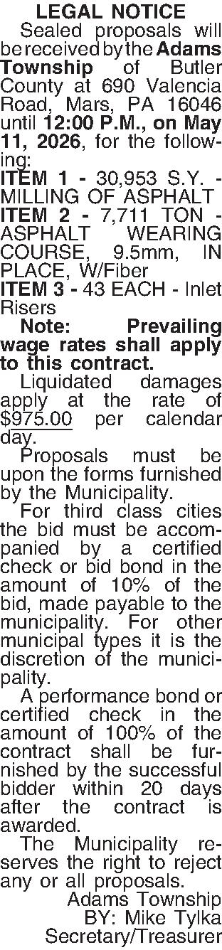 LEGAL NOTICE ¶ Sealed proposals will be received by the Adams Township ofButler Countyat690 Valencia Road, Mars, PA 16046 until 12:00 P.M., on May 11, 2026,for the following: ITEM 1 - 30,953 S.Y. - MILLING OF ASPHALT ITEM 2 - 7,711 TON - ASPHALT WEARING COURSE, 9.5mm, IN PLACE, W/Fiber ITEM 3 - 43 EACH - Inlet Risers ¶ Note: Prevailing wage rates shall apply to this contract. ¶ Liquidated damages apply at the rate of $975.00 per calendar day. ¶ Proposals must be upon the forms furnished by the Municipality. ¶ For third class cities the bid must be accompanied by a certified check or bid bond in the amount of 10% of the bid, made payable to the municipality. For other municipal types it is the discretion of the municipality. ¶ A performance bond or certified check in the amount of 100% of the contract shall be furnished by the successful bidder within 20 days after the contract is awarded. ¶ The Municipality reserves the right to reject any or all proposals. Adams Township BY: Mike Tylka Secretary/Treasurer