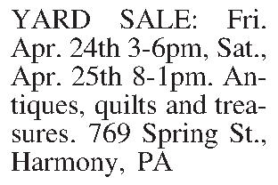YARD SALE: Fri. Apr. 24th 3-6pm, Sat., Apr. 25th 8-1pm. Antiques, quilts and treasures. 769 Spring St., Harmony, PA