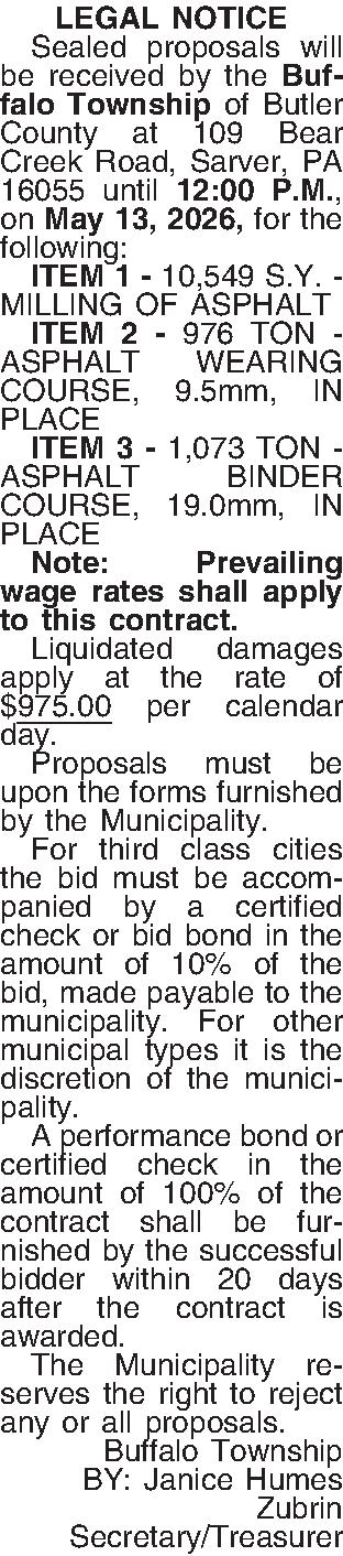 Sealed proposals will be received by the Buffalo Township of Butler County at 109 Bear Creek Road, Sarver, PA 16055 until 12:00 P.M., on May 13, 2026, for the following: