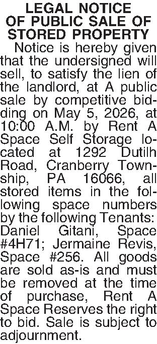 LEGAL NOTICE OF PUBLIC SALE OF STORED PROPERTY ¶ Notice is hereby given that the undersigned will sell, to satisfy the lien of the landlord, at A public sale by competitive bidding on May 5, 2026, at 10:00 A.M. by Rent A Space Self Storage located at 1292 Dutilh Road, Cranberry Township, PA 16066, all stored items in the following space numbers by the following Tenants: Daniel Gitani, Space #4H71; Jermaine Revis, Space #256. All goods are sold as-is and must be removed at the time of purchase, Rent A Space Reserves the right to bid. Sale is subject to adjournment.