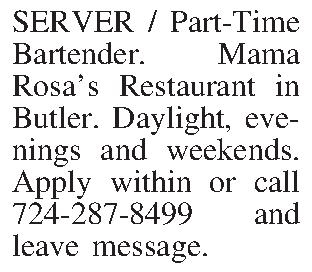 SERVER / Part-Time Bartender. Mama Rosa’s Restaurant in Butler. Daylight, eve-nings and weekends. Apply within or call 724-287-8499 and leave message.