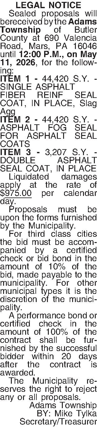 LEGAL NOTICE ¶ Sealed proposals will bereceived by the Adams Township ofButler Countyat690 Valencia Road, Mars, PA 16046 until 12:00 P.M., on May 11, 2026,for the following: ITEM 1 - 44,420 S.Y. - SINGLE ASPHALT FIBER REINF SEAL COAT, IN PLACE, Slag Agg ITEM 2 - 44,420 S.Y. - ASPHALT FOG SEAL FOR ASPHALT SEAL COATS ITEM 3 - 3,207 S.Y. - DOUBLE ASPHALT SEAL COAT, IN PLACE ¶ Liquidated damages apply at the rate of $975.00 per calendar day. ¶ Proposals must be upon the forms furnished by the Municipality. ¶ For third class cities the bid must be accompanied by a certified check or bid bond in the amount of 10% of the bid, made payable to the municipality. For other municipal types it is the discretion of the municipality. ¶ A performance bond or certified check in the amount of 100% of the contract shall be furnished by the successful bidder within 20 days after the contract is awarded. ¶ The Municipality reserves the right to reject any or all proposals. Adams Township BY: Mike Tylka Secretary/Treasurer