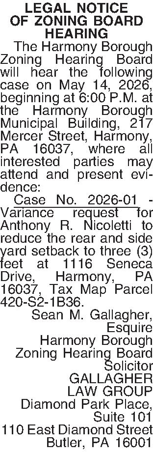LEGAL NOTICE OF ZONING BOARD HEARING ¶ The Harmony Borough Zoning Hearing Board will hear the following case on May 14, 2026, beginning at 6:00 P.M. at the Harmony Borough Municipal Building, 217 Mercer Street, Harmony, PA 16037, where all interested parties may attend and present evidence: ¶ Case No. 2026-01 - Variance request for Anthony R. Nicoletti to reduce the rear and side yard setback to three (3) feet at 1116 Seneca Drive, Harmony, PA 16037, Tax Map Parcel 420-S2-1B36. Sean M. Gallagher, Esquire Harmony Borough Zoning Hearing Board Solicitor GALLAGHER LAW GROUP Diamond Park Place, Suite 101 110 East Diamond Street Butler, PA 16001