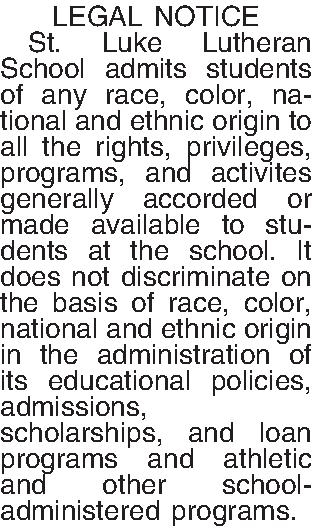 ¶ St. Luke Lutheran School admits students of any race, color, national and ethnic origin to all the rights, privileges, programs, and activites generally accorded or made available to students at the school. It does not discriminate on the basis of race, color, national and ethnic origin in the administration of its educational policies, admissions, scholarships, and loan programs and athletic and other school-administered programs.
