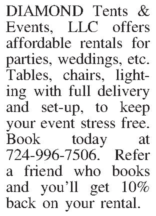DIAMOND Tents & Events, LLC offers affordable rentals for parties, weddings, etc. Tables, chairs, light-ing with full delivery and set-up, to keep your event stress free. Book today at 724-996-7506. Refer a friend who books and you’ll get 10% back on your rental.