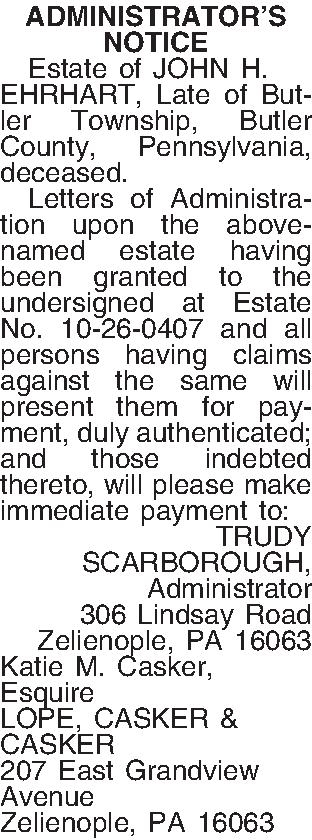 ADMINISTRATOR’S NOTICE ¶ Estate of JOHN H. EHRHART, Late of Butler Township, Butler County, Pennsylvania, deceased. ¶ Letters of Administration upon the above-named estate having been granted to the undersigned at Estate No. 10-26-0407 and all persons having claims against the same will present them for payment, duly authenticated; and those indebted thereto, will please make immediate payment to: TRUDY SCARBOROUGH, Administrator 306 Lindsay Road Zelienople, PA 16063 Katie M. Casker, Esquire LOPE, CASKER & CASKER 207 East Grandview Avenue Zelienople, PA 16063