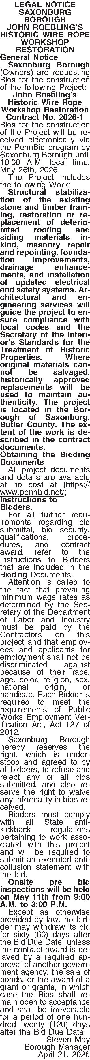 Bids for the construction of the Project will be received electronically via the PennBid program by Saxonburg Borough until 10:00 A.M. local time, May 26th, 2026.