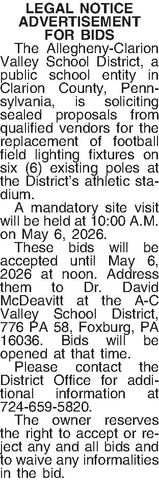 ¶ The Allegheny-Clarion Valley School District, a public school entity in Clarion County, Pennsylvania, is soliciting sealed proposals from qualified vendors for the replacement of football field lighting fixtures on six (6) existing poles at the District’s athletic stadium.