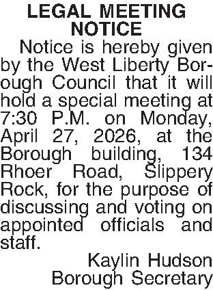 LEGAL MEETING NOTICE ¶ Notice is hereby given by the West Liberty Borough Council that it will hold a special meeting at 7:30 P.M. on Monday, April 27, 2026, at the Borough building, 134 Rhoer Road, Slippery Rock, for the purpose of discussing and voting on appointed officials and staff. Kaylin Hudson Borough Secretary
