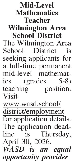 Mid-Level Mathematics Teacher Wilmington Area School District The Wilmington Area School District is seeking applicants for a full-time permanent mid-level mathematics (grades 5-8) teaching position. Visit www.wasd.school/district/employment for application details. The application deadline is Thursday, April 30, 2026. WASD is an equal opportunity provider