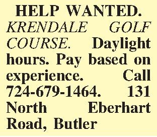 KRENDALE GOLF COURSE. Daylight hours. Pay based on experience. Call 724-679-1464. 131 North Eberhart Road, Butler