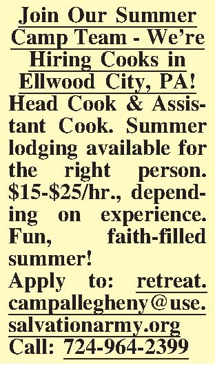 Join Our Summer Camp Team - We’re Hiring Cooks in Ellwood City, PA! Head Cook & Assistant Cook. Summer lodging available for the right person. $15-$25/hr., depending on experience. Fun, faith-filled summer! Apply to: retreat.campallegheny@use.salvationarmy.org Call: 724-964-2399