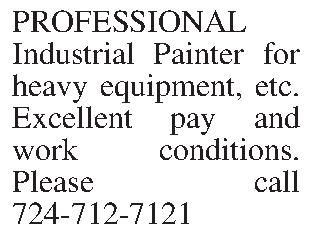 PROFESSIONAL Industrial Painter for heavy equipment, etc. Excellent pay and work conditions. Please call 724-712-7121