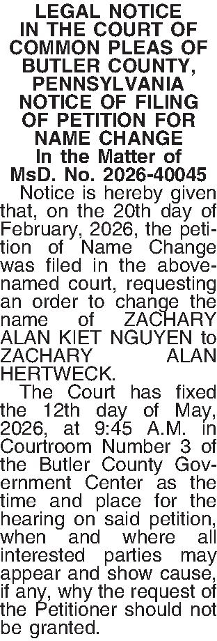 ¶ Notice is hereby given that, on the 20th day of February, 2026, the petition of Name Change was filed in the above-named court, requesting an order to change the name of ZACHARY ALAN KIET NGUYEN to ZACHARY ALAN HERTWECK.