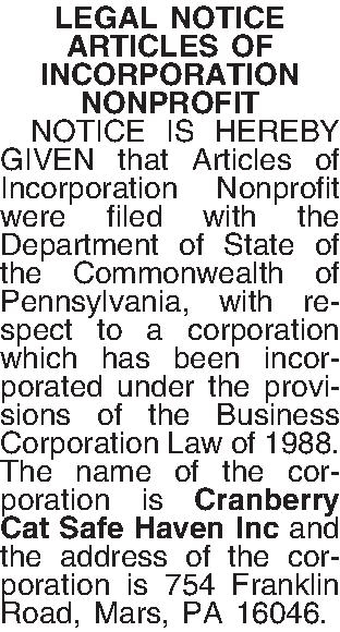 LEGAL NOTICE ARTICLES OF INCORPORATION NONPROFIT ¶ NOTICE IS HEREBY GIVEN that Articles of Incorporation Nonprofit were filed with the Department of State of the Commonwealth of Pennsylvania, with respect to a corporation which has been incorporated under the provisions of the Business Corporation Law of 1988. The name of the corporation is Cranberry Cat Safe Haven Inc and the address of the corporation is 754 Franklin Road, Mars, PA 16046.