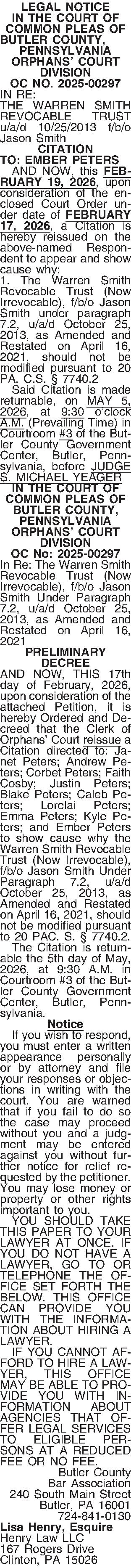 AND NOW, THIS 17th day of February, 2026, upon consideration of the attached Petition, it is hereby Ordered and Decreed that the Clerk of Orphans’ Court reissue a Citation directed to: Janet Peters; Andrew Peters; Corbet Peters; Faith Cosby; Justin Peters; Blake Peters; Caleb Peters; Lorelai Peters; Emma Peters; Kyle Peters; and Ember Peters to show cause why the Warren Smith Revocable Trust (Now Irrevocable), f/b/o Jason Smith Under Paragraph 7.2, u/a/d October 25, 2013, as Amended and Restated on April 16, 2021, should not be modified pursuant to 20 PAC. S. § 7740.2.