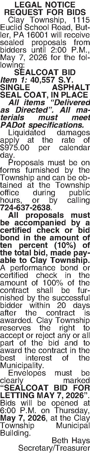 LEGAL NOTICE REQUEST FOR BIDS ¶ Clay Township, 1115 Euclid School Road, Butler, PA 16001 will receive sealed proposals from bidders until 2:00 P.M., May 7, 2026 for the following: SEALCOAT BID Item 1: 40,557 S.Y. SINGLE ASPHALT SEAL COAT, IN PLACE ¶ All items “Delivered as Directed”. All materials must meet PADot specifications. ¶ Liquidated damages apply at the rate of $975.00 per calendar day. ¶ Proposals must be on forms furnished by the Township and can be obtained at the Township office during public hours, or by calling 724-637-2638. ¶ All proposals must be accompanied by a certified check or bid bond in the amount of ten percent (10%) of the total bid, made payable to Clay Township. A performance bond or certified check in the amount of 100% of the contract shall be furnished by the successful bidder within 20 days after the contract is awarded. Clay Township reserves the right to accept or reject any or all part of the bid and to award the contract in the best interest of the Municipality. ¶ Envelopes must be clearly marked “SEALCOAT BID FOR LETTING MAY 7, 2026”. Bids will be opened at 6:00 P.M. on Thursday, May 7, 2026, at the Clay Township Municipal Building. Beth Hays Secretary/Treasurer