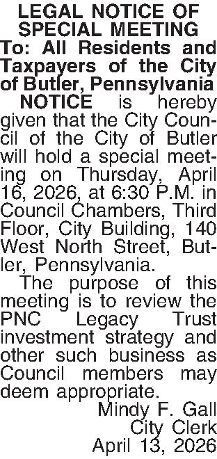 LEGAL NOTICE OF SPECIAL MEETING To: All Residents and Taxpayers of the City of Butler, Pennsylvania ¶ NOTICE is hereby given that the City Council of the City of Butler will hold a special meeting on Thursday, April 16, 2026, at 6:30 P.M. in Council Chambers, Third Floor, City Building, 140 West North Street, Butler, Pennsylvania. ¶ The purpose of this meeting is to review the PNC Legacy Trust investment strategy and other such business as Council members may deem appropriate. Mindy F. Gall City Clerk April 13, 2026