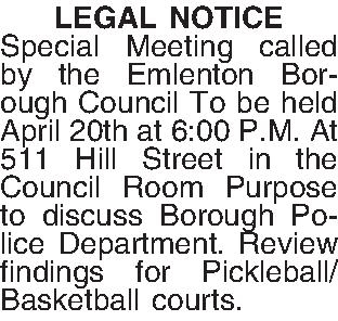 LEGAL NOTICE Special Meeting called by the Emlenton Borough Council To be held April 20th at 6:00 P.M. At 511 Hill Street in the Council Room Purpose to discuss Borough Police Department. Review findings for Pickleball/Basketball courts.